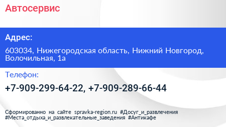 Автосервис по адресу 603034, Нижегородская область, Нижний Новгород, Волочильная, 1а в дальнейшем Организация, размещена в следующих категориях: