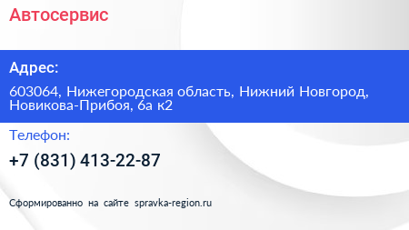 Автосервис по адресу 603064, Нижегородская область, Нижний Новгород, Новикова-Прибоя, 6а к2 в дальнейшем Организация, размещена в следующих категориях: