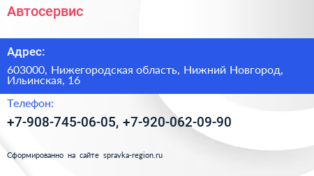 Автосервис по адресу 603000, Нижегородская область, Нижний Новгород, Ильинская, 16 в дальнейшем Организация, размещена в следующих категориях: