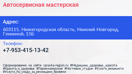 Автосервисная мастерская по адресу 603115, Нижегородская область, Нижний Новгород, Генкиной, 15Б в дальнейшем Организация, размещена в следующих категориях: