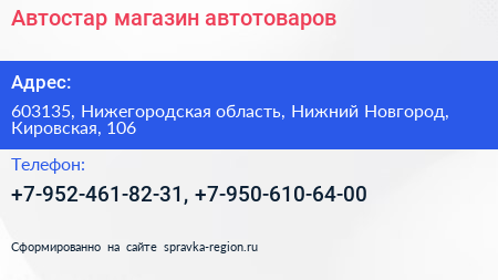 Автостар, магазин автотоваров по адресу 603135, Нижегородская область, Нижний Новгород, Кировская, 106 в дальнейшем Организация, размещена в следующих категориях:
