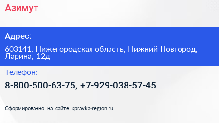 Азимут по адресу 603141, Нижегородская область, Нижний Новгород, Ларина, 12д в дальнейшем Организация, размещена в следующих категориях: