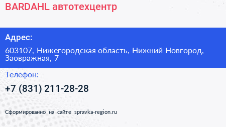 BARDAHL, автотехцентр по адресу 603107, Нижегородская область, Нижний Новгород, Заовражная, 7 в дальнейшем Организация, размещена в следующих категориях: