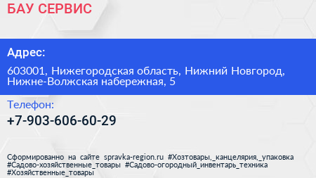 БАУ СЕРВИС по адресу 603001, Нижегородская область, Нижний Новгород, Нижне-Волжская набережная, 5 в дальнейшем Организация, размещена в следующих категориях: