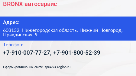 BRONX, автосервис по адресу 603132, Нижегородская область, Нижний Новгород, Правдинская, 9 в дальнейшем Организация, размещена в следующих категориях: