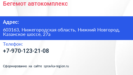 Бегемот, автокомплекс по адресу 603163, Нижегородская область, Нижний Новгород, Казанское шоссе, 27а в дальнейшем Организация, размещена в следующих категориях: