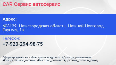 CAR-Сервис, автосервис по адресу 603139, Нижегородская область, Нижний Новгород, Гаугеля, 1в в дальнейшем Организация, размещена в следующих категориях: