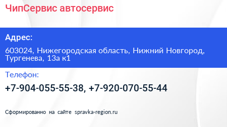 ЧипСервис, автосервис по адресу 603024, Нижегородская область, Нижний Новгород, Тургенева, 13а к1 в дальнейшем Организация, размещена в следующих категориях: