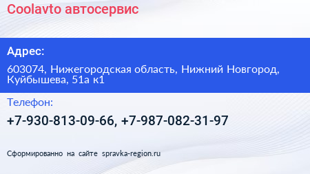 Coolavto, автосервис по адресу 603074, Нижегородская область, Нижний Новгород, Куйбышева, 51а к1 в дальнейшем Организация, размещена в следующих категориях: