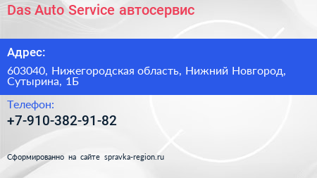 Das Auto Service, автосервис по адресу 603040, Нижегородская область, Нижний Новгород, Сутырина, 1Б в дальнейшем Организация, размещена в следующих категориях: