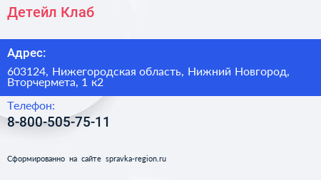 Детейл Клаб по адресу 603124, Нижегородская область, Нижний Новгород, Вторчермета, 1 к2 в дальнейшем Организация, размещена в следующих категориях: