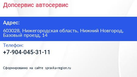 Допсервис, автосервис по адресу 603028, Нижегородская область, Нижний Новгород, Базовый проезд, 14 в дальнейшем Организация, размещена в следующих категориях: