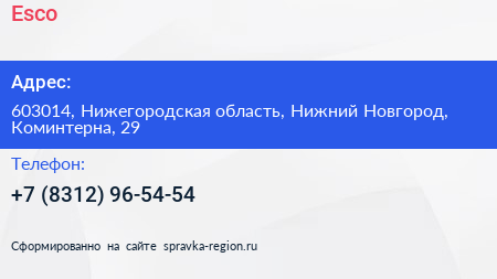 Esco по адресу 603014, Нижегородская область, Нижний Новгород, Коминтерна, 29 в дальнейшем Организация, размещена в следующих категориях: