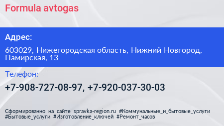 Formula avtogas по адресу 603029, Нижегородская область, Нижний Новгород, Памирская, 13 в дальнейшем Организация, размещена в следующих категориях:
