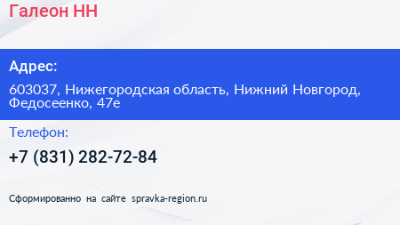 Галеон-НН по адресу 603037, Нижегородская область, Нижний Новгород, Федосеенко, 47е в дальнейшем Организация, размещена в следующих категориях: