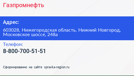 Газпромнефть по адресу 603028, Нижегородская область, Нижний Новгород, Московское шоссе, 248а в дальнейшем Организация, размещена в следующих категориях:
