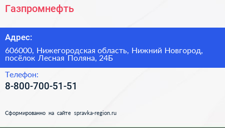 Газпромнефть по адресу 606000, Нижегородская область, Нижний Новгород, посёлок Лесная Поляна, 24Б в дальнейшем Организация, размещена в следующих категориях: