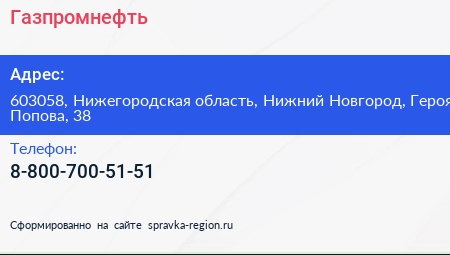 Газпромнефть по адресу 603058, Нижегородская область, Нижний Новгород, Героя Попова, 38 в дальнейшем Организация, размещена в следующих категориях: