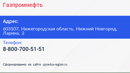 Газпромнефть по адресу 603107, Нижегородская область, Нижний Новгород, Ларина, 2 в дальнейшем Организация, размещена в следующих категориях: