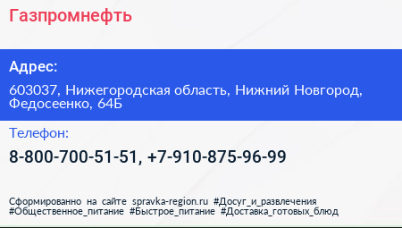Газпромнефть по адресу 603037, Нижегородская область, Нижний Новгород, Федосеенко, 64Б в дальнейшем Организация, размещена в следующих категориях: