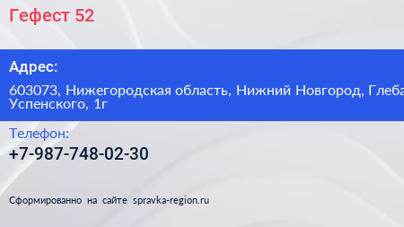 Гефест-52 по адресу 603073, Нижегородская область, Нижний Новгород, Глеба Успенского, 1г в дальнейшем Организация, размещена в следующих категориях: