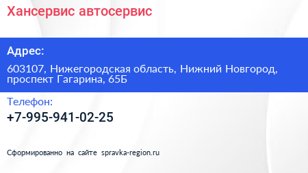 Хансервис, автосервис по адресу 603107, Нижегородская область, Нижний Новгород, проспект Гагарина, 65Б в дальнейшем Организация, размещена в следующих категориях: