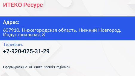 ИТЕКО Ресурс по адресу 607910, Нижегородская область, Нижний Новгород, Индустриальная, 8 в дальнейшем Организация, размещена в следующих категориях: