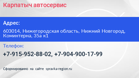 Карпатыч, автосервис по адресу 603014, Нижегородская область, Нижний Новгород, Коминтерна, 35а к1 в дальнейшем Организация, размещена в следующих категориях:
