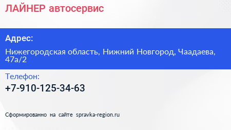 ЛАЙНЕР, автосервис по адресу Нижегородская область, Нижний Новгород, Чаадаева, 47а/2 в дальнейшем Организация, размещена в следующих категориях: