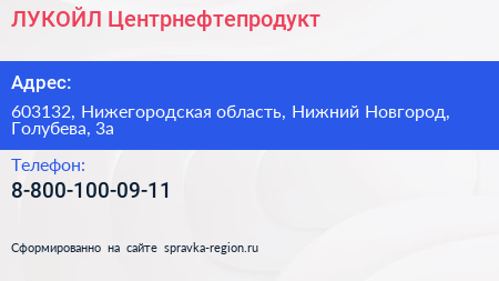 ЛУКОЙЛ-Центрнефтепродукт по адресу 603132, Нижегородская область, Нижний Новгород, Голубева, 3а в дальнейшем Организация, размещена в следующих категориях: