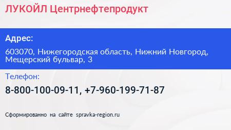 ЛУКОЙЛ-Центрнефтепродукт по адресу 603070, Нижегородская область, Нижний Новгород, Мещерский бульвар, 3 в дальнейшем Организация, размещена в следующих категориях: