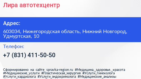 Лира, автотехцентр по адресу 603034, Нижегородская область, Нижний Новгород, Удмуртская, 10 в дальнейшем Организация, размещена в следующих категориях: