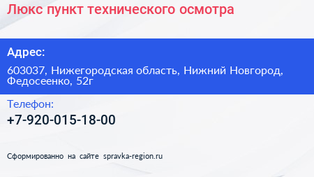 Люкс, пункт технического осмотра по адресу 603037, Нижегородская область, Нижний Новгород, Федосеенко, 52г в дальнейшем Организация, размещена в следующих категориях: