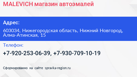 MALEVICH, магазин автоэмалей по адресу 603034, Нижегородская область, Нижний Новгород, Алма-Атинская, 15 в дальнейшем Организация, размещена в следующих категориях:
