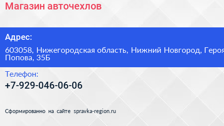 Магазин авточехлов по адресу 603058, Нижегородская область, Нижний Новгород, Героя Попова, 35Б в дальнейшем Организация, размещена в следующих категориях: