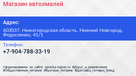 Магазин автоэмалей по адресу 603037, Нижегородская область, Нижний Новгород, Федосеенко, 41/1 в дальнейшем Организация, размещена в следующих категориях: