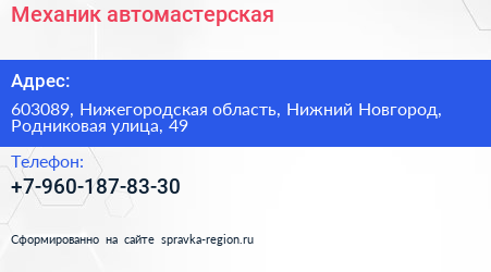 Механик, автомастерская по адресу 603089, Нижегородская область, Нижний Новгород, Родниковая улица, 49 в дальнейшем Организация, размещена в следующих категориях: