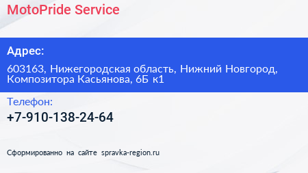 MotoPride Service по адресу 603163, Нижегородская область, Нижний Новгород, Композитора Касьянова, 6Б к1 в дальнейшем Организация, размещена в следующих категориях: