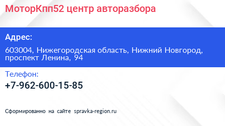 МоторКпп52, центр авторазбора по адресу 603004, Нижегородская область, Нижний Новгород, проспект Ленина, 94 в дальнейшем Организация, размещена в следующих категориях: