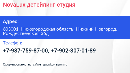 NovaLux, детейлинг-студия по адресу 603001, Нижегородская область, Нижний Новгород, Рождественская, 36д в дальнейшем Организация, размещена в следующих категориях: