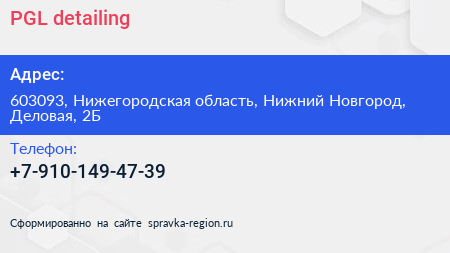 PGL detailing по адресу 603093, Нижегородская область, Нижний Новгород, Деловая, 2Б в дальнейшем Организация, размещена в следующих категориях: