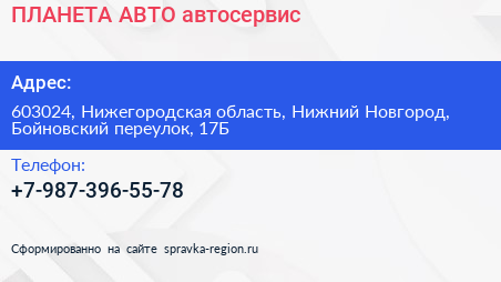 ПЛАНЕТА-АВТО, автосервис по адресу 603024, Нижегородская область, Нижний Новгород, Бойновский переулок, 17Б в дальнейшем Организация, размещена в следующих категориях: