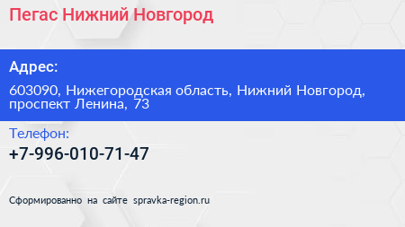 Пегас Нижний Новгород по адресу 603090, Нижегородская область, Нижний Новгород, проспект Ленина, 73 в дальнейшем Организация, размещена в следующих категориях: