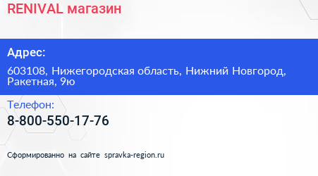 RENIVAL, магазин по адресу 603108, Нижегородская область, Нижний Новгород, Ракетная, 9ю в дальнейшем Организация, размещена в следующих категориях: