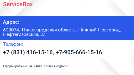 ServiceBox по адресу 603074, Нижегородская область, Нижний Новгород, Нефтегазовская, 2а в дальнейшем Организация, размещена в следующих категориях: