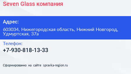 Seven-Glass, компания по адресу 603034, Нижегородская область, Нижний Новгород, Удмуртская, 37а в дальнейшем Организация, размещена в следующих категориях: