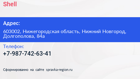 Shell по адресу 603002, Нижегородская область, Нижний Новгород, Долгополова, 84а в дальнейшем Организация, размещена в следующих категориях: