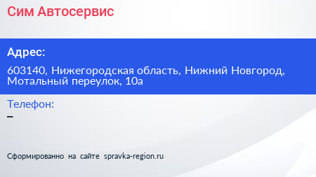 Сим Автосервис по адресу 603140, Нижегородская область, Нижний Новгород, Мотальный переулок, 10а в дальнейшем Организация, размещена в следующих категориях:
