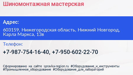 Шиномонтажная мастерская по адресу 603159, Нижегородская область, Нижний Новгород, Карла Маркса, 13в в дальнейшем Организация, размещена в следующих категориях:
