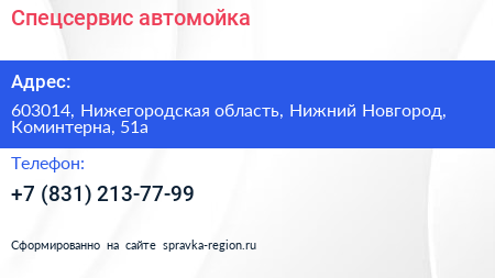 Спецсервис, автомойка по адресу 603014, Нижегородская область, Нижний Новгород, Коминтерна, 51а в дальнейшем Организация, размещена в следующих категориях: